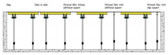 Để kéo dài khoảng cách đáng kể giữa các bộ ván khuôn bàn thông thường, có thể sử dụng các miếng chèn bằng ván ép. Để cố định tấm ván ép vào giá đỡ bằng thép bao gồm dầm gỗ H20, đầu bàn hoặc đầu bốn chiều là không cần thiết. Ngoài ra, khi không thể đặt ván khuôn bàn bổ sung ở mép sàn, dầm đỡ làm bằng gỗ H20 và ván ép phải được sử dụng kết hợp với neo thép.